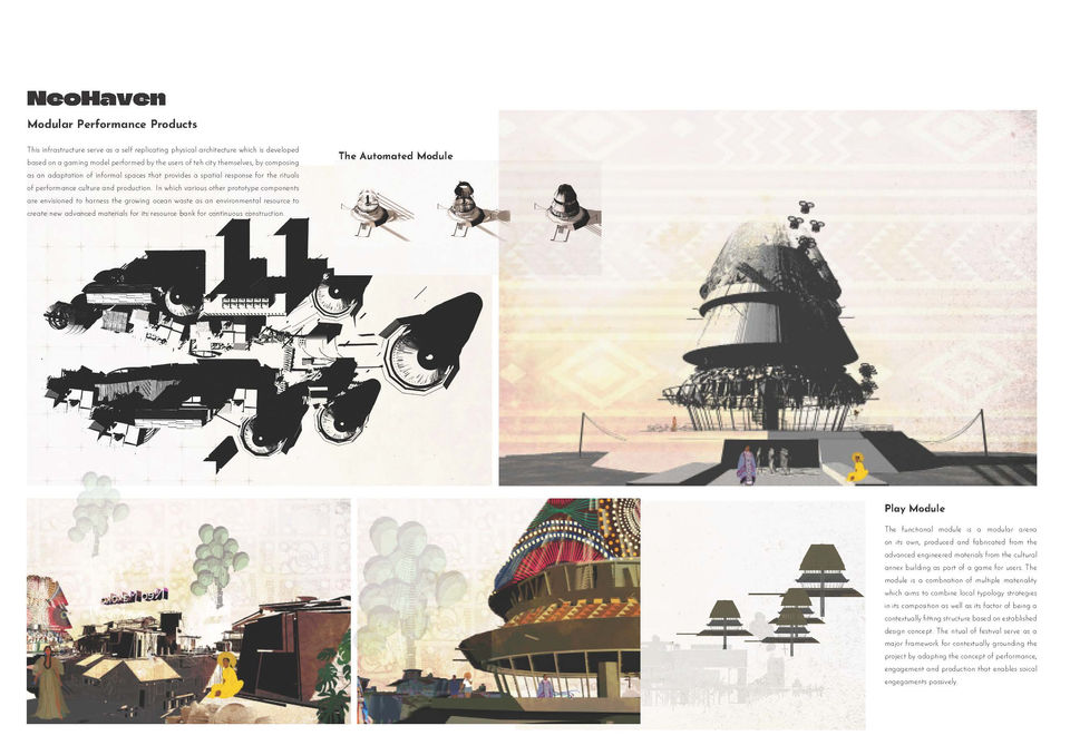The proposal comprises of an urban structure narrative that is structured across the cityscape. Situated in the heart of the city is the “The Cultural Annex” — A multidimensional urban development that encapsulates dynamic clusters in and around the facility, with its core spatial development which combines the functions of performance, entertainment and facilitating the production of advanced materials for new urban structures — ‘Neohaven modules’ across the informal landscape of the city. This infrastructure serve as a self replicating physical architecture which is developed to exist as a system for continual performatory constructs and physical evolution, by composing as an adaptation of informal spaces that provides a spatial response for the rituals of performance and production.
